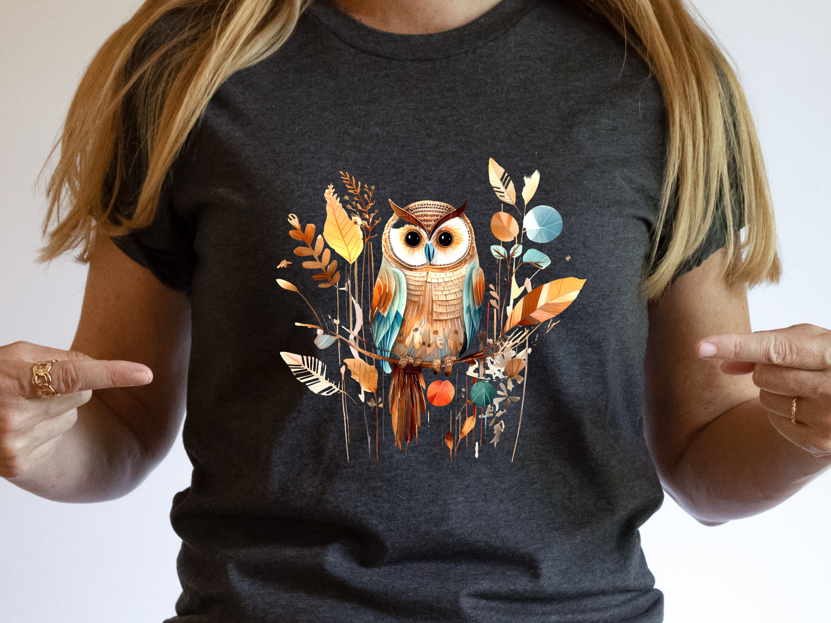 This stylish t-shirt features a unique design of a modern boho botanical owl, carefully crafted with minimalist patchwork patterns. Its earthy palette of brown, red, and teal colours makes it a versatile addition to any wardrobe. The owl, a symbol of wisdom and knowledge, adds a touch of mystique to this trendy piece. The blend of boho and minimalist aesthetics strikes a perfect balance between complexity and simplicity, making it a great choice for lovers of modern and vintage styles alike. This t-shirt would make a special gift for those who appreciate nature, artistry, and fashion.