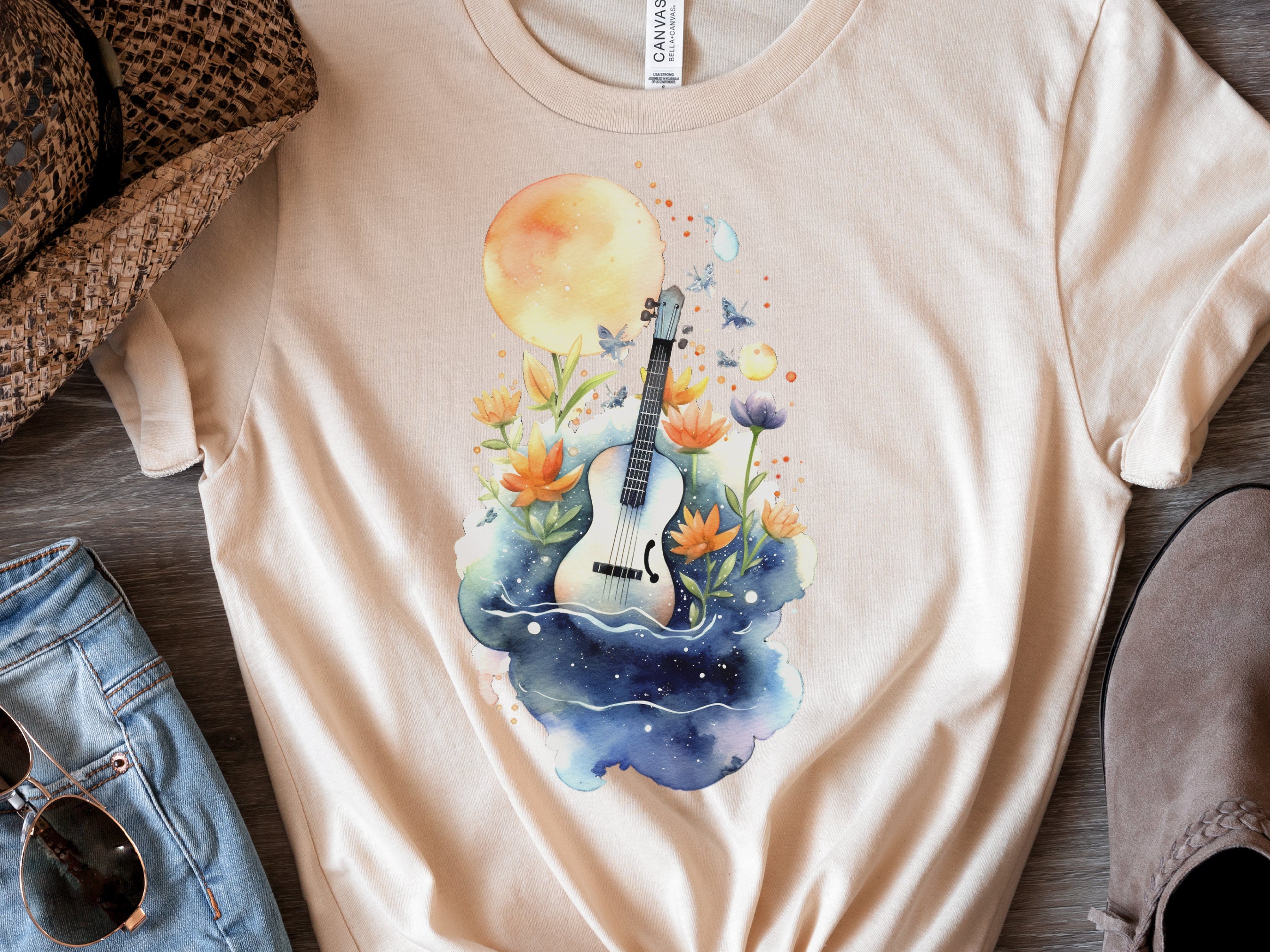 πŸŽ„ 2025 Holiday Shipping Deadlines – to ensure delivery before Christmas, please order by: 10-packs: πŸ‡¬πŸ‡§πŸ‡ΊπŸ‡ΈπŸ‡¨πŸ‡¦πŸ‡¦πŸ‡Ί – 17th Dec | Other countries – 12th Dec (contact us if unsure) Singles & 5-packs: πŸ‡¬πŸ‡§ UK – 17th Dec πŸ‡ΊπŸ‡Έ US – 10th Dec πŸ‡¨πŸ‡¦ Canada & 🌍 Rest of World – 2nd Dec ✨ Good news for US customers: We ship via carriers that won't incur US tariff charges! 🌳 Every Order Plants A Tree! 🌳 This adorable t-shirt features a simple watercolour design showcasing a cute guitar, a full moon, and delicate flowers. The symbolic combination of music, nature, and celestial elements adds a touch of whimsy and serenity to the shirt. It makes a great gift for music lovers, fans of charming illustrations, or anyone who appreciates unique and artistic fashion. Perfect for birthdays, holidays, or just because!